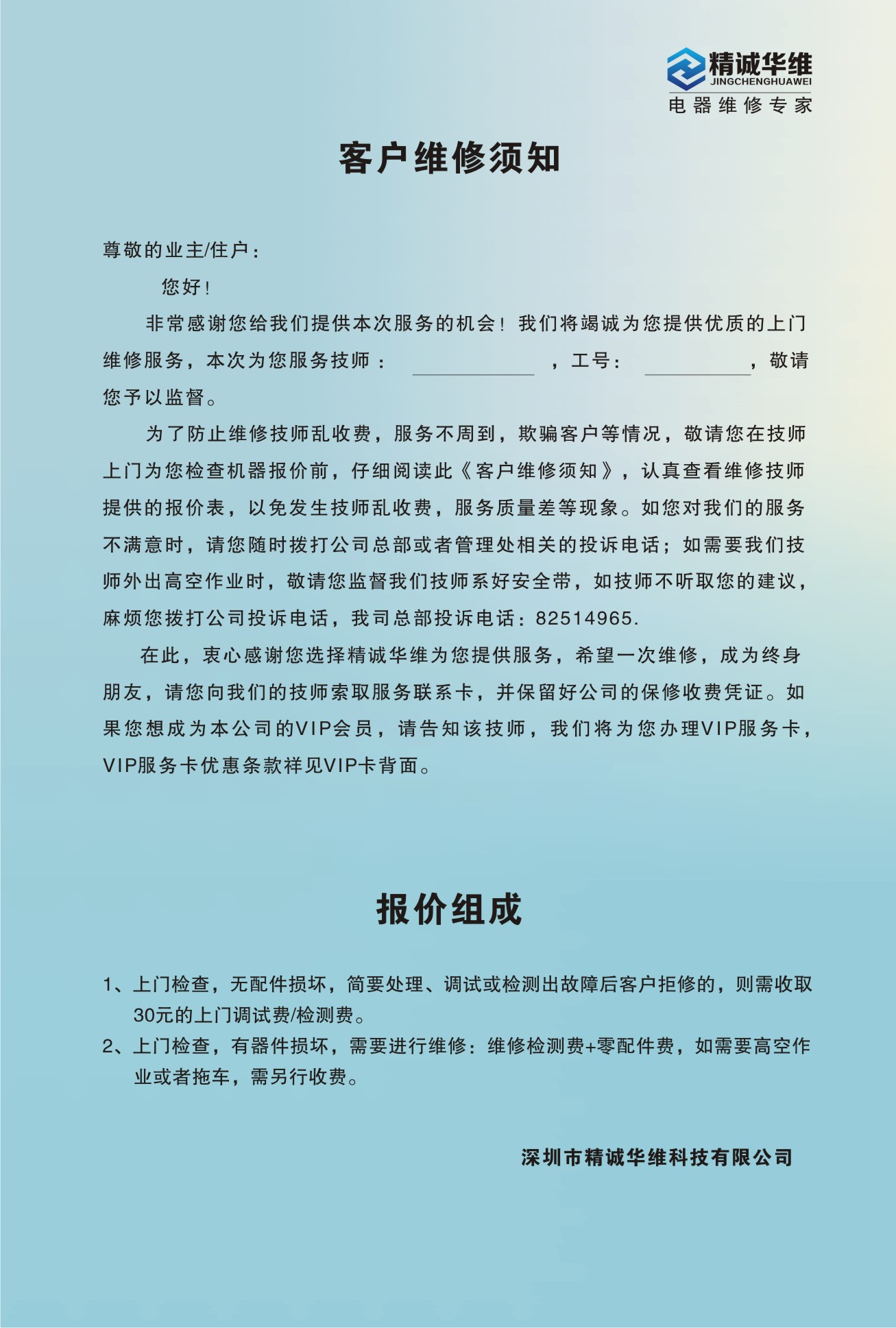 1、技师在上门服务检修报价前,必须出示此《客户维